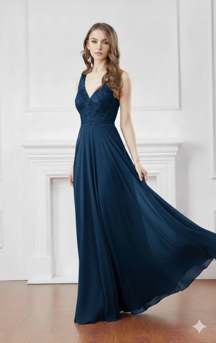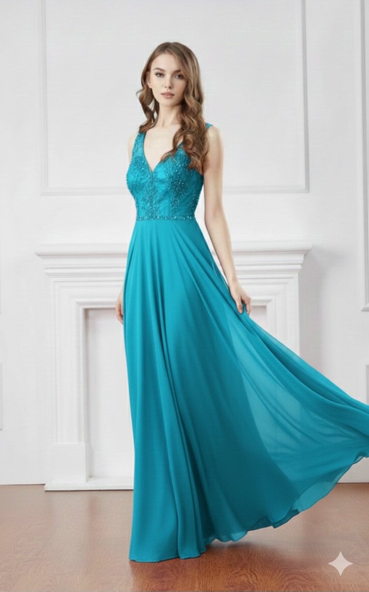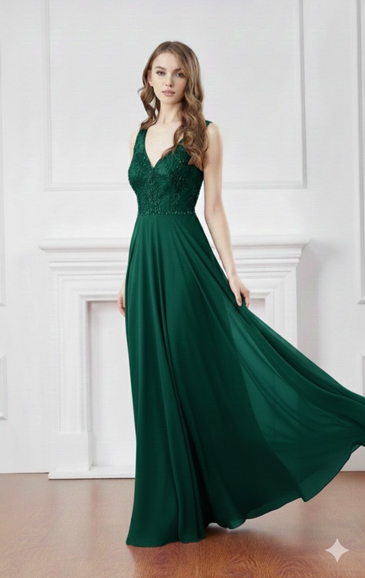 Vestido comprido vaséTecido: ChiffonDecote: Decote "V" com missangas e pedrasParte